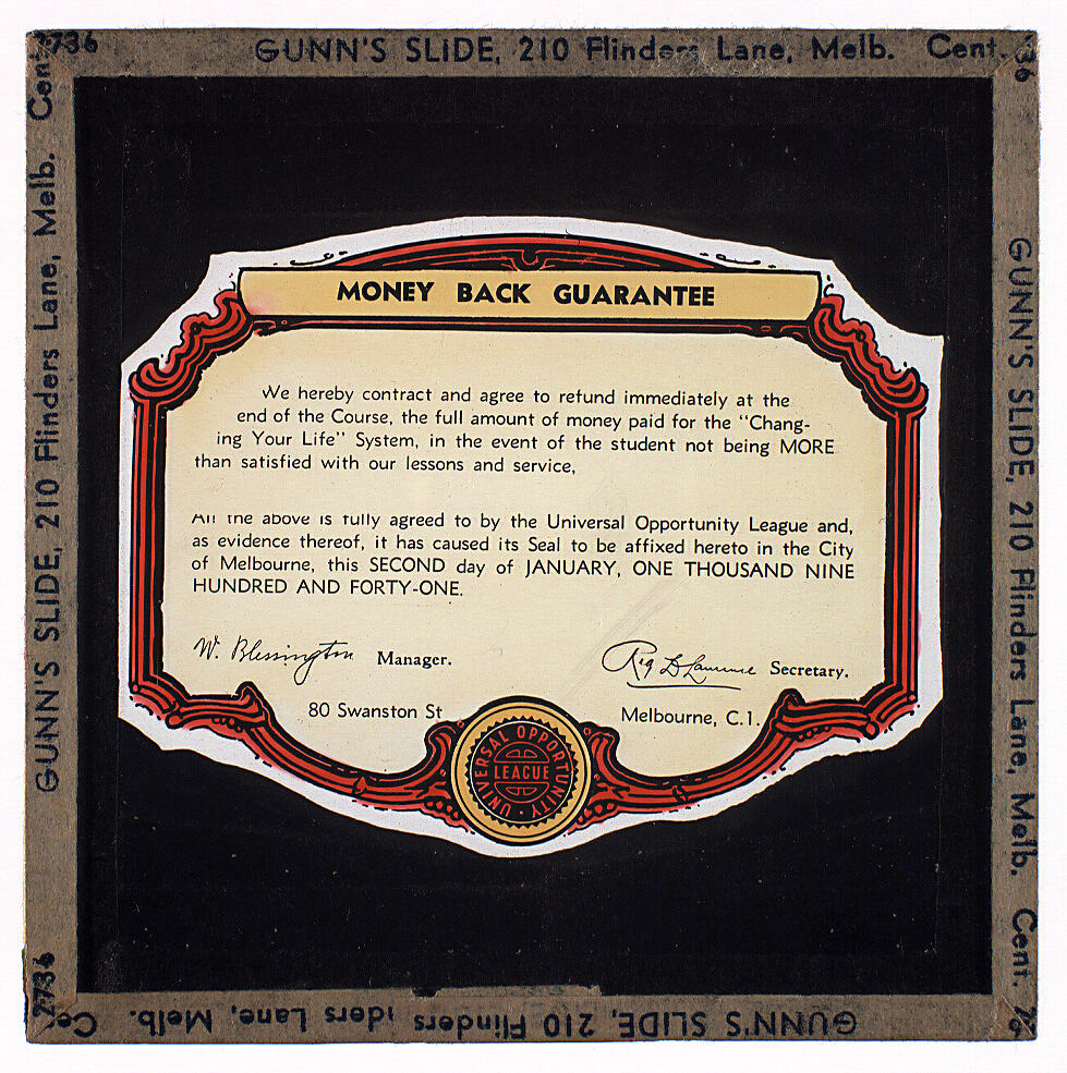 Colour glass lantern slide of a money back guarantee issued by the Universal Opportunity League, 80 Swanston Street, Melbourne, Victoria, dated 2 Jan 1941. Made by Alex. Gunn & Sons, Melbourne, Victoria, circa 1940s.