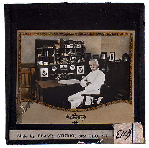 Lantern slide of photograph of Macpherson Robertson sitting at his desk, circa 1930s. Robertson (1859-1945) was a noted Melbourne businessman, confectionery manufacturer and philanthropist. Made by Beavis Studio, Sydney, New South Wales, circa 1930s-1940s.