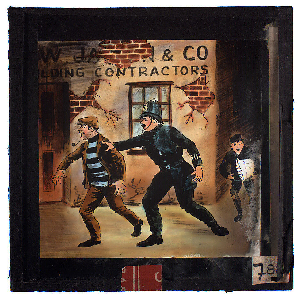 Colour glass lantern slide of a cartoon showing a policeman apparently catching a burglar.