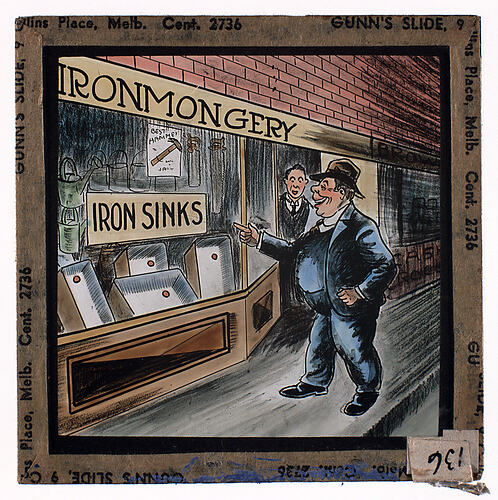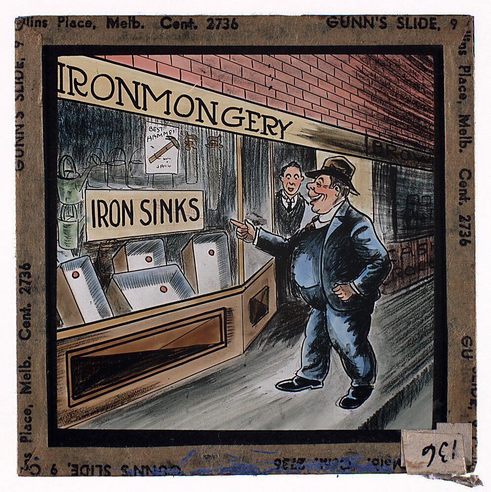 Colour glass lantern slide of a cartoon of a man outside an ironmonger's shop, laughing at a sign advertising 'Iron Sinks'. Made by Alex. Gunn & Sons, Melbourne, Victoria, circa 1930s.