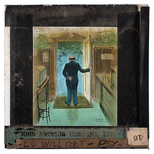 Text, on slide: JOHN SWINSON COMPANY, LTD. Text on attached label: '16' Text handwritten on attached label: '?LU WILL GET - PSY -.