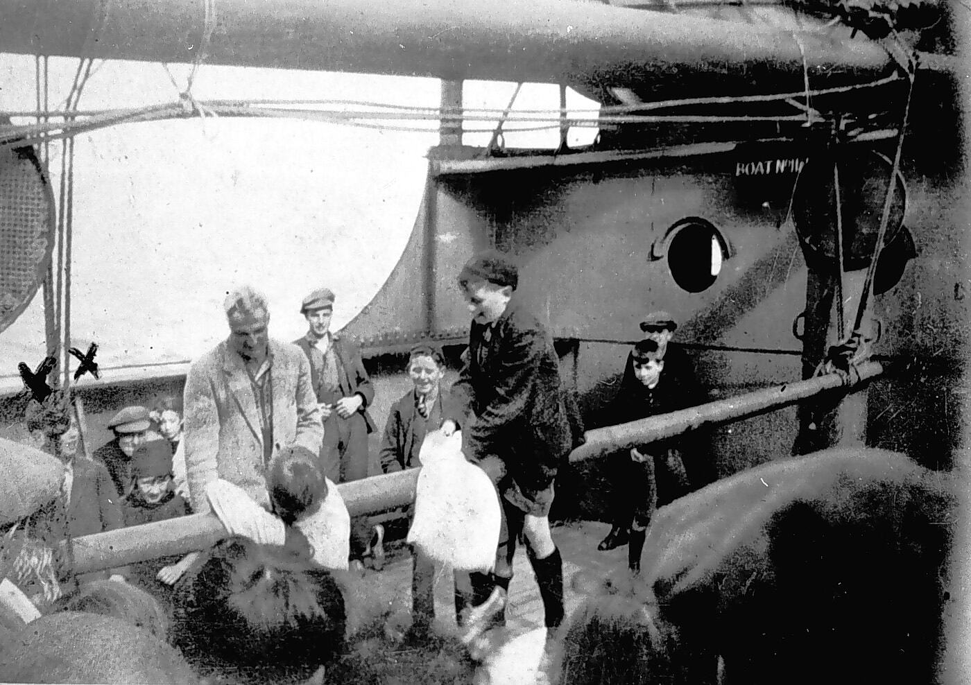 Small boys on a greasy pole on the SS Beltana. One boy is straddling the pole while another is leaning against it. There are two crosses marking the boy on the far left.