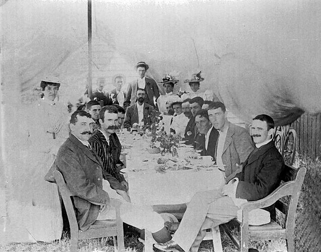 A group, mostly male, seated at a long table in a tent. Three women and another man stand behind the group. The men appear to have just finished a meal.