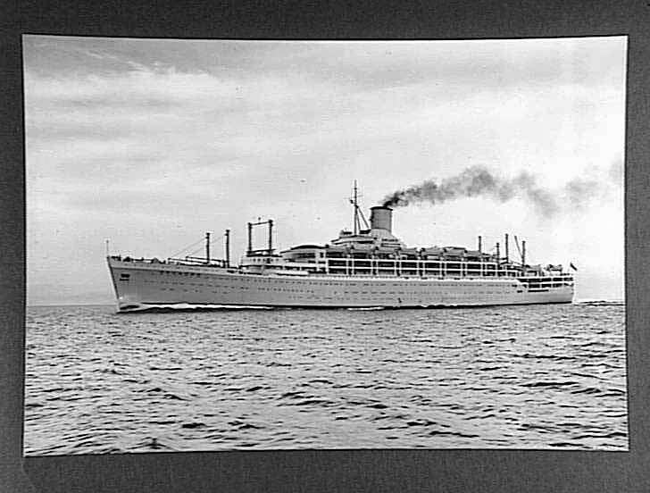 Port side three-quarter profile over bow showing of the newly-completed Orient Line passenger liner RMS Orcades, steaming at full speed with smoke trailing from the funnel, prominent white foam bow wave and wake. Photograph probably taken during the vessel's official speed trials conducted in the Firth of Forth, Scotland, November 1948.
