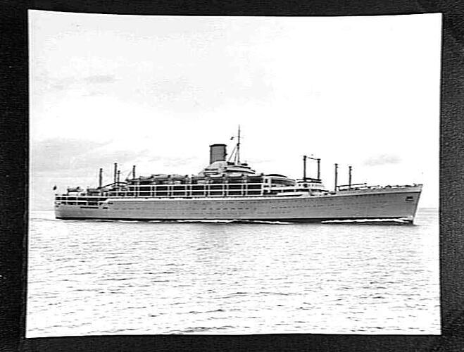 Three-quarter angle view from forward over bow showing starboard side of the Orient Line passenger steamer RMS Orcades travelling at full speed. Probably taken during the ship's offical speed trials off the Isle of Arran, Firth of Clyde, Scotland, held in early November, 1948, during which the vessel registered a maximum speed of 24.7 knots over the measured nautical mile.