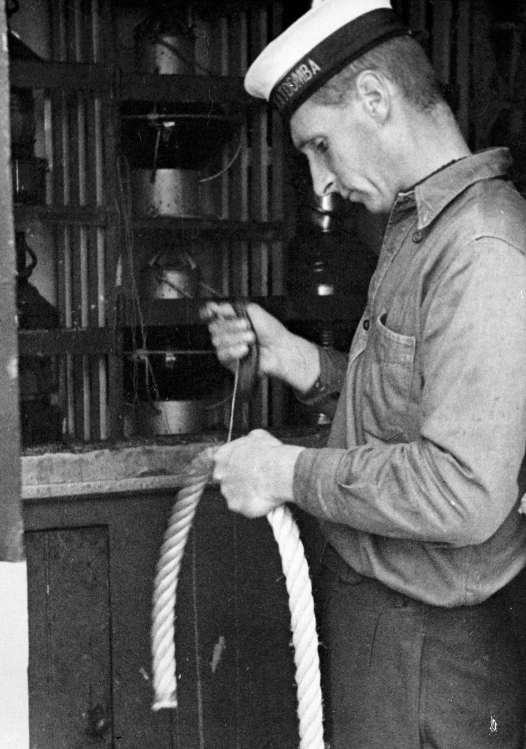 Sailor on board S.S. Katoomba making quoits. Title: 'Making more quoits'
