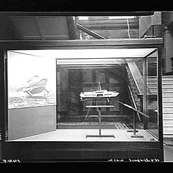 Photographic negative showing a model of a P.T. 50 hydrofoil boat at the Institute of Applied Science (Science Museum), in 1966. The boat was displayed alongside a 'Bluebird' turbo-jet car in the main foyer of the Swanston Street building.