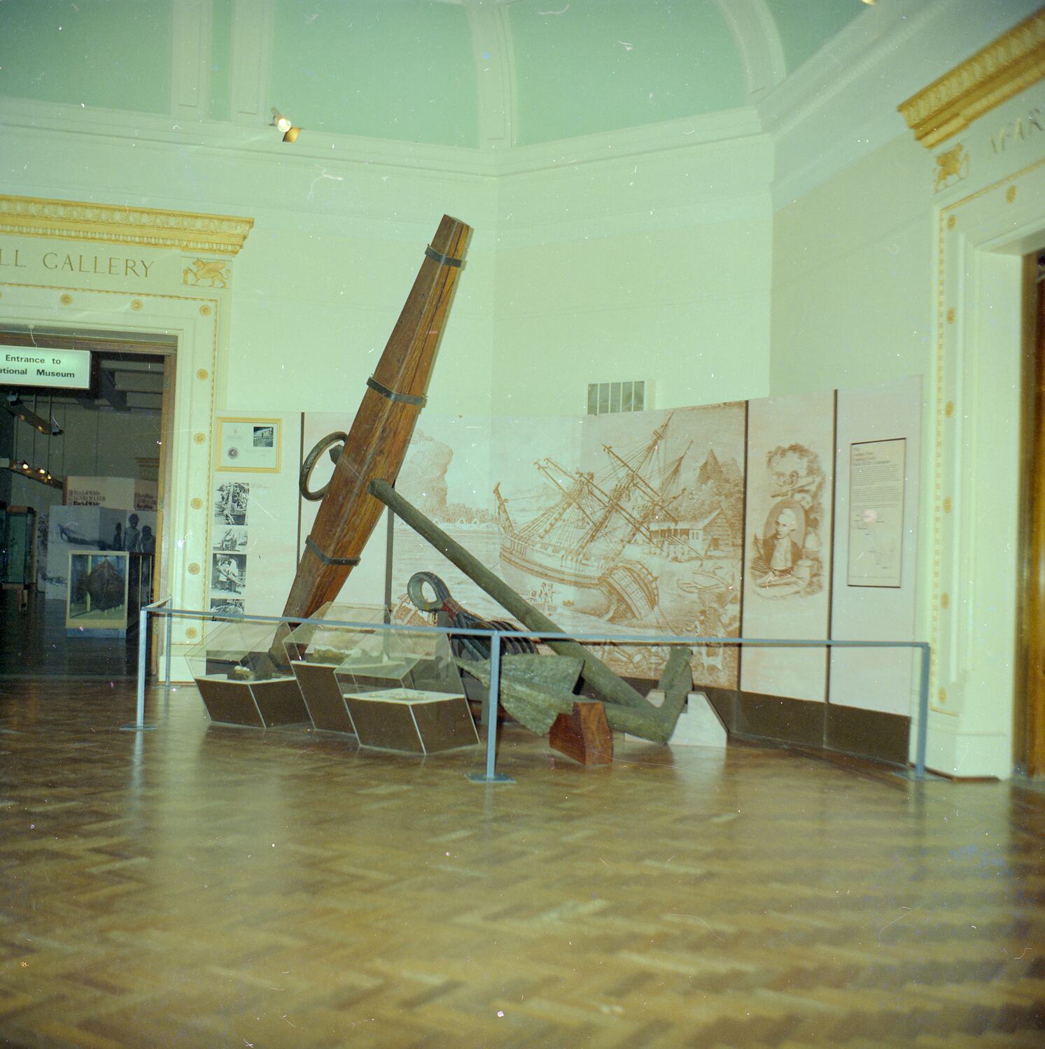Photographic negative depicting the anchor of the H.M.S. 'Endeavour' on display in Stawell Gallery at the Science Museum, 1970. The anchor was a centrepiece of the James Cook Bicentenary exhibition, organised in a joint effort by the Science Museum, the National Museum of Victoria and the State Library of Victoria.
