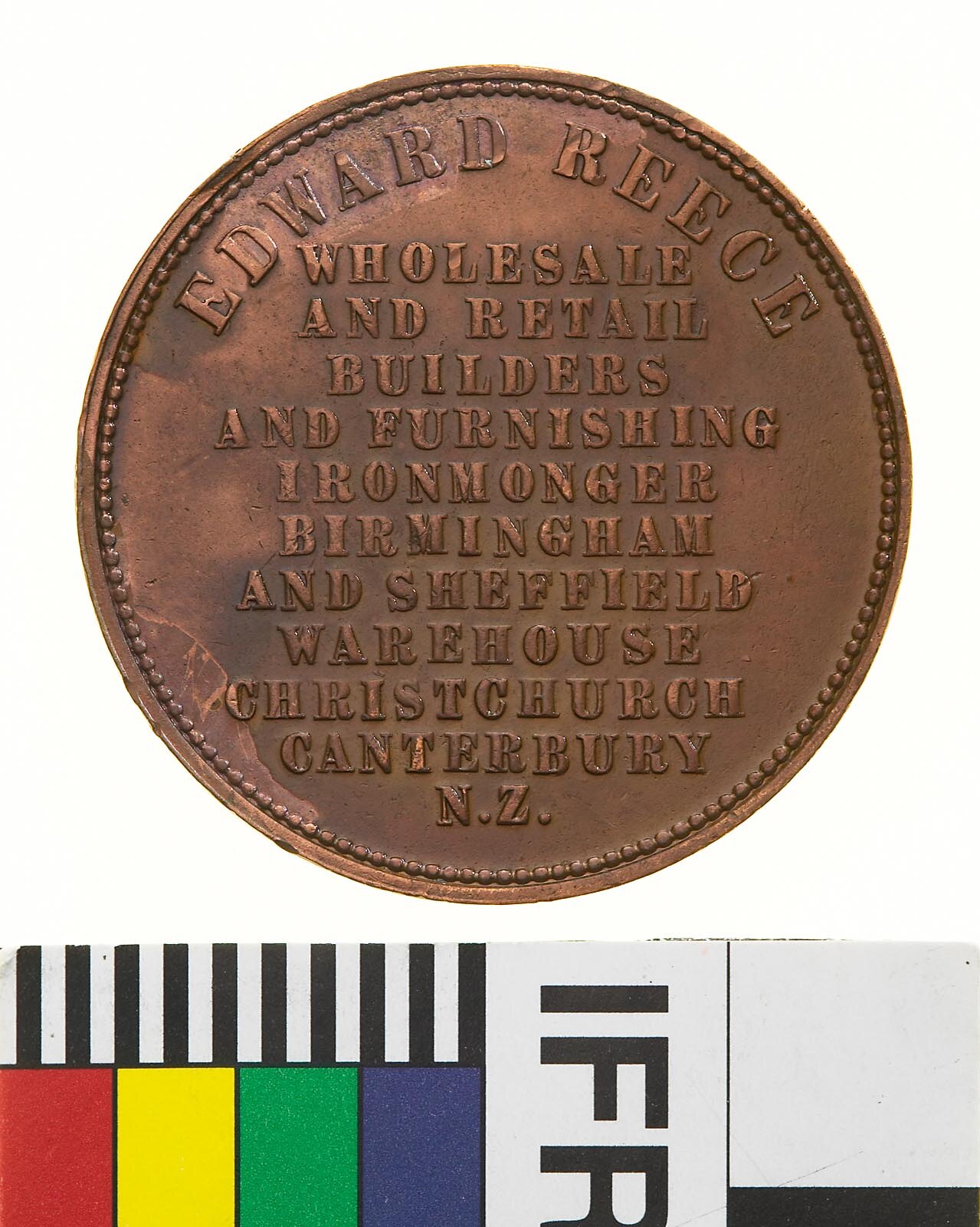 Obverse: EDWARD REECE WHOLESALE AND RETAIL BUILDERS AND FURNISHING IRONMONGER BIRMINGHAM AND SHEFFIELD WAREHOUSE CANTERBURY N.Z. Reverse: ADVANCE CANTERBURY NEW ZEALAND