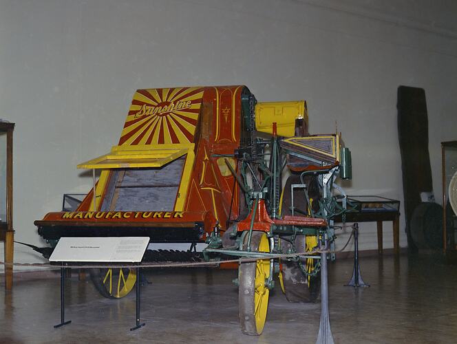 Restored 'Sunshine' Harvester on display in the Agriculture display in Swinburne Hall, Science Museum of Victoria.
