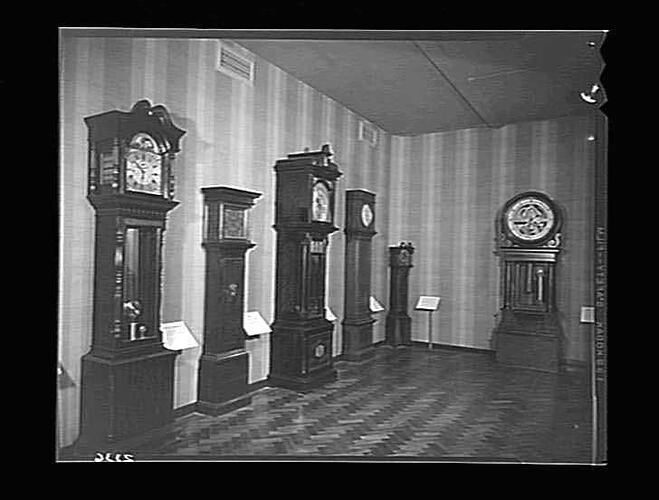 View of the clock bay, displaying longcase clocks, in Barry Hall, Science Museum of Victoria, August 1970.