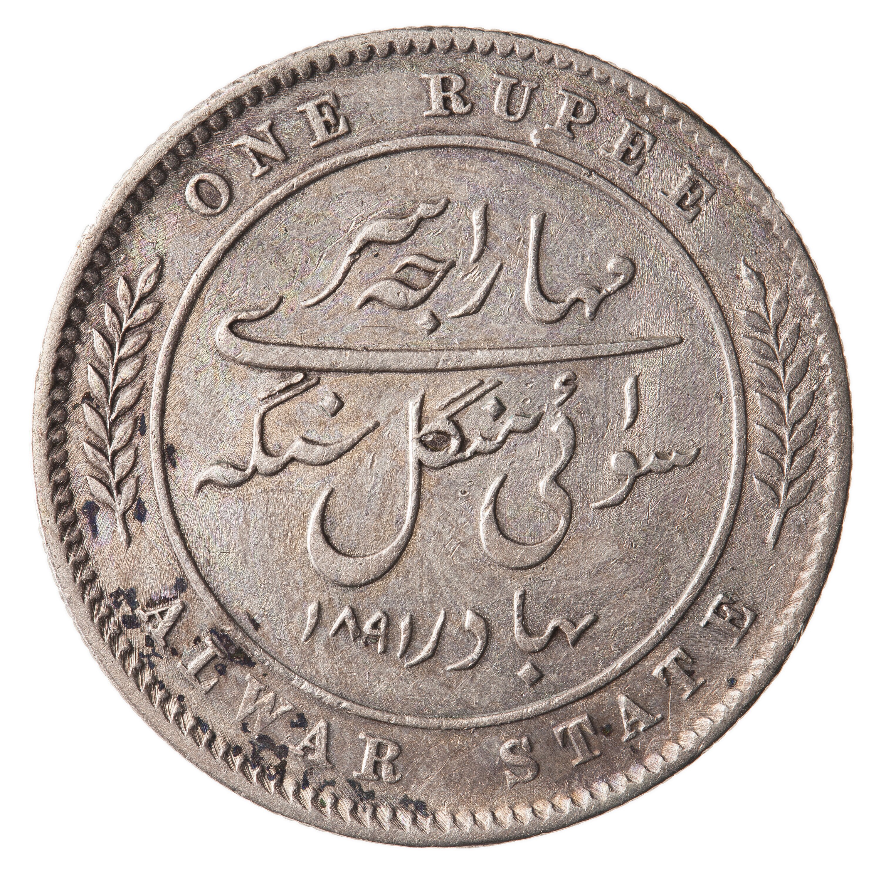 Within a line circle, Persian legend ending with date 1891 in Persian numerals; around above, ONE RUPEE; around below, ALWAR STATE