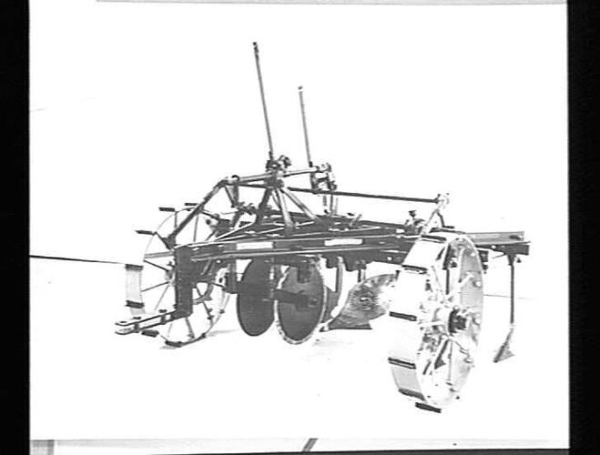 "`SUNGRUBBER': OCT 1931" FRONT VIEW OF A TRACTOR-DRAWN `SUNGRUBBER' FITTED WITH DELVER SHARES, TYNES AND DISCS. NOTE THE STEEL WHEELS FITTED WITH GRIPS FOR EXTRA TRACTION FOR LIFTING THE MACHINE CLEAR OF THE GROUND.,