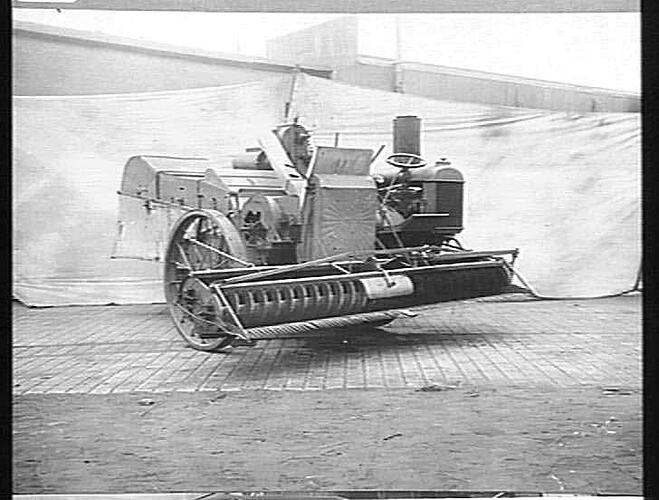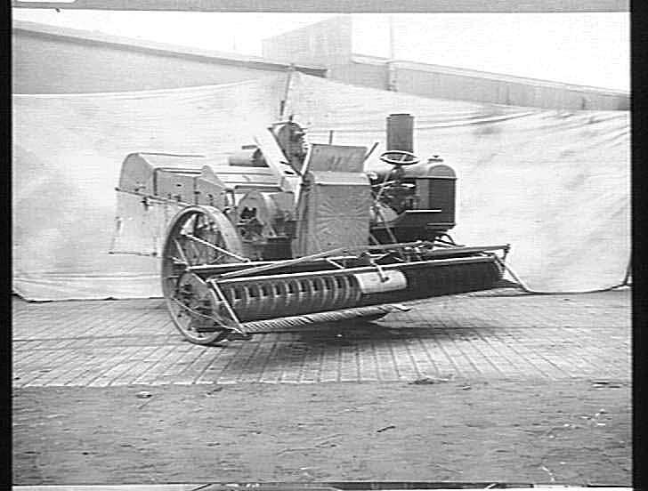 A Fordson-powered 'W' type auto header - a self propelled grain harvester developed at the Sunshine factory. Note the spirals on the left and right have reverse actions so enabling the crop to be fed directly into the grain elevator.