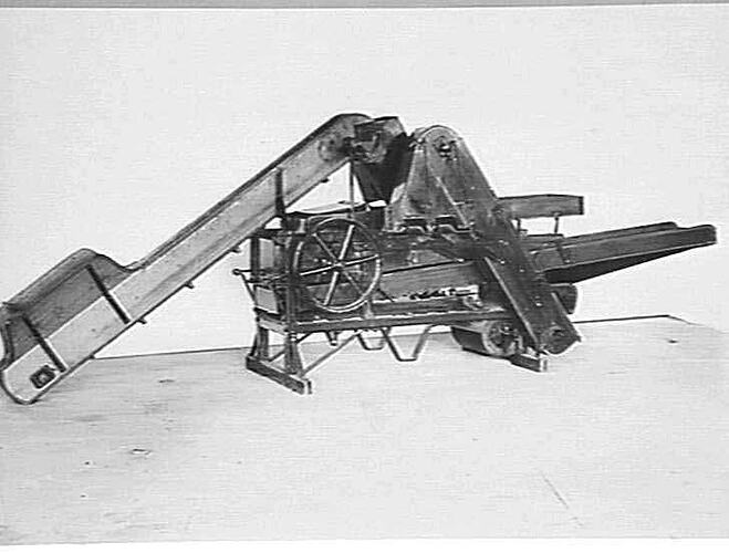 "JUNE 1923: MAIZE HUSKER WITH ELEVATOR FEED" PHOTO OF A STATIONARY MAIZE HUSKER AND SHELLER: THE MAIZE COBS ARE FED ONTO THE ELEVATOR FROM WHERE THEY ARE CARRIED THROUGH TO THE THRESHING DRUM. BY MEANS OF SCREENS, THE SEED FALLS TO THE BOTTOM OF THE ELEVATOR FROM WHERE IT IS CARRIED TO THE BAGGING-OFF SECTION.
