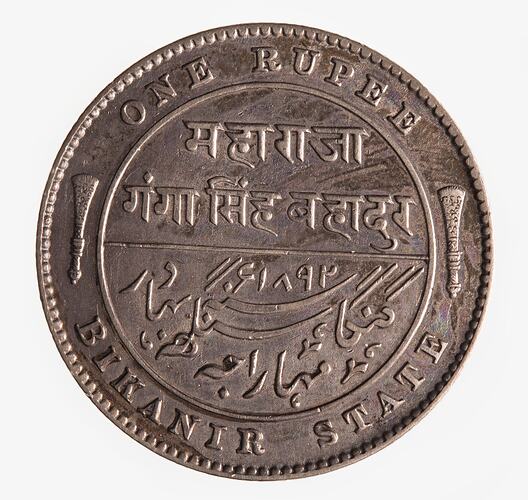 Within a line circle divided by a horizontal line, the name of Maharaja Ganga Singh in Nagari and Persian, Persian legend starting with date 1892 in Persian numerals; around above, ONE RUPEE; around below, BIKANIR STATE