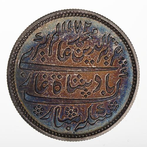 Legend in Persian script (translation: 1172 the auspicious coin of the Victorious Emperor chosen of the faith of Muhammad, Alamgir) Note: the legend and date are of a frozen type, they do not name the issuer nor give the date of production