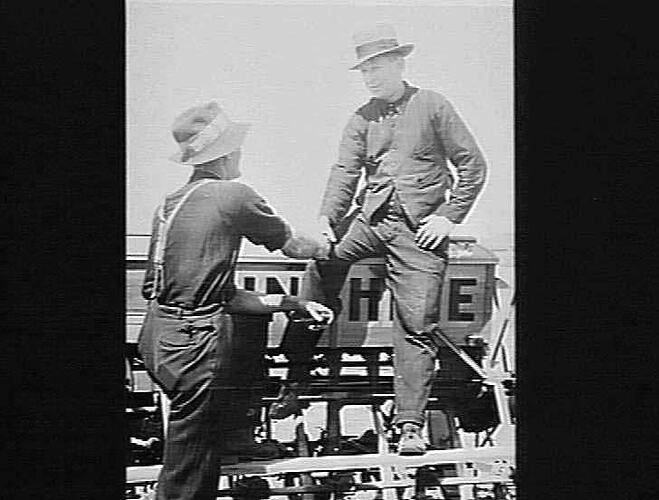'The Xmas (Christmas) greeting ' a two men shaking hands on a'Suntyne' combine/drill cultivator. This machine has metal covers for the grain and fertiliser box.
