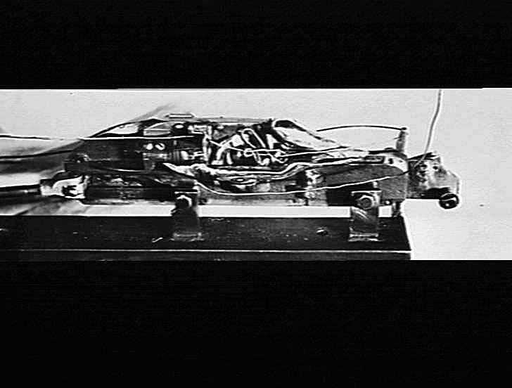 Close-up view of the unique H.V. McKay wire-tying mechanism (designed in Australia by Mr Tom Connor): a world-first, which tied a figure-8 knot, using 14 gauge black wire (as shown). This was used on the automatic-threading Sunshine baler for tying bales.