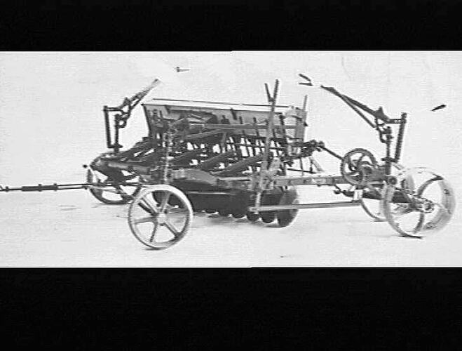 No.9 'Sundercut' fitted with grain & fertilizer hopper which was then called a'Sunderseeder'. Drive to the hopper was from the near-side rear wheel by sprocket and chain. Footboards were fitted at the rear of the machine to enable the operator to fill the hoppers from bags.