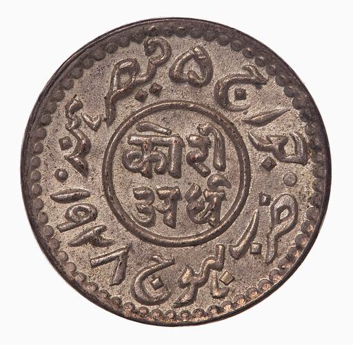 Within a line circle; legend in two lines of Devanagari characters; around legend in Persian (including the date 1928 and name of George V)