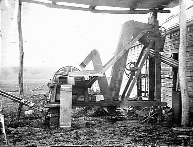 '1918' a stationary chaff cutter with the chaff being directed (via a piece of galvanised iron) directly into the shed.