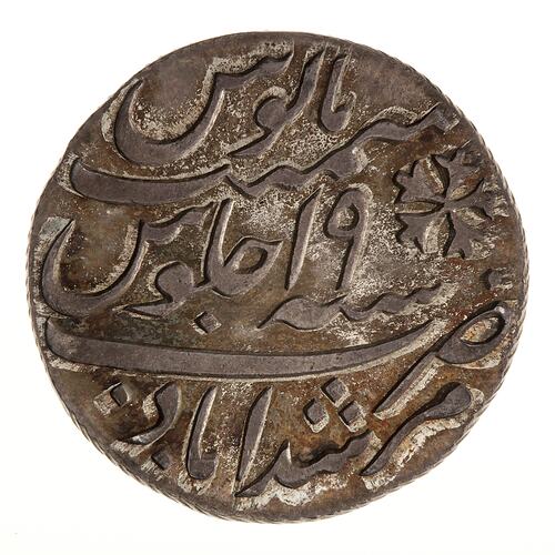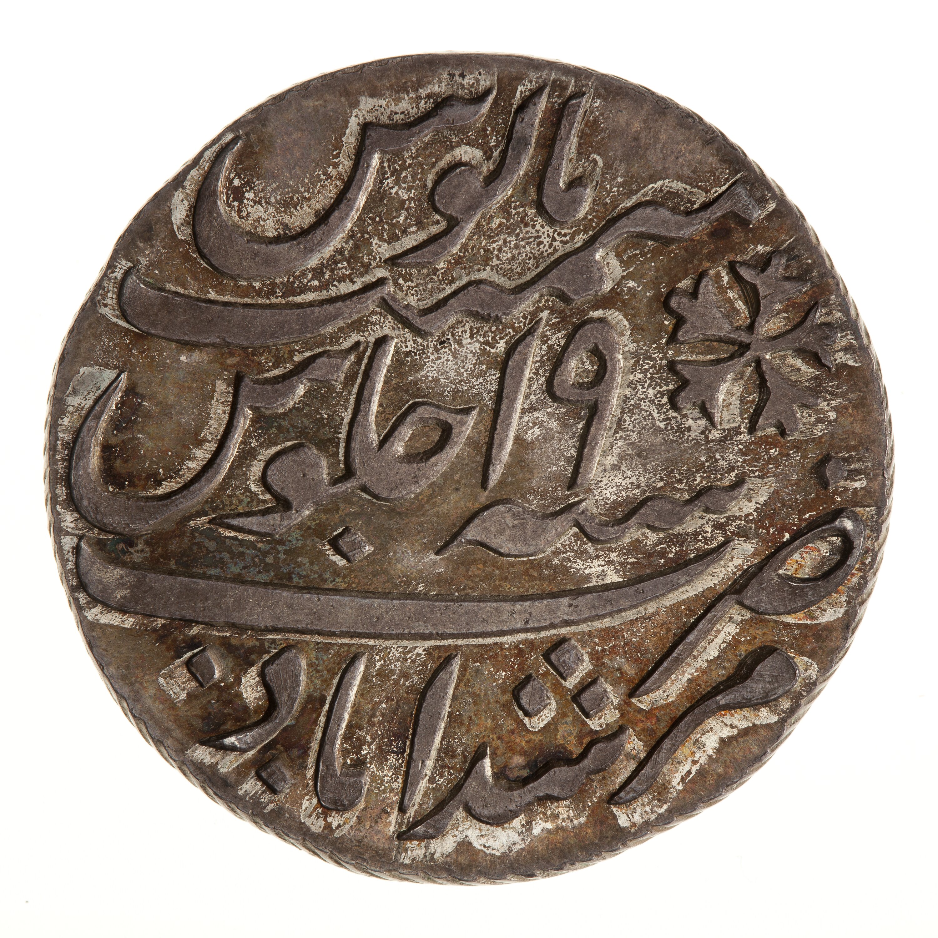 Persian Julus formular (Pridmore 13) (translation: Struck at the mint of Murshidabad in year 19 of his reign of tranquil prosperity) incomplete die, dots not added