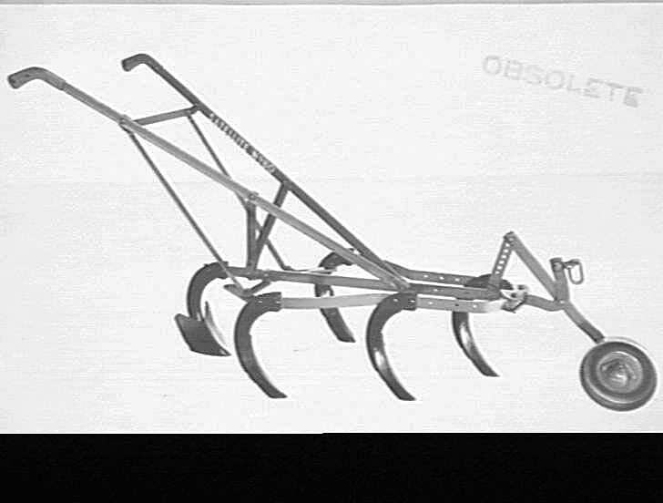 Side view of a horse-drawn No.80 'Satellite' scuffler fitted with 5 tynes, the rear being fitted with a furrower. The working depth is controlled by manual adjustment to the front wheel. For longer wear, the tyne-points are reversible. This implement was used mainly for vineyard and orchard work.