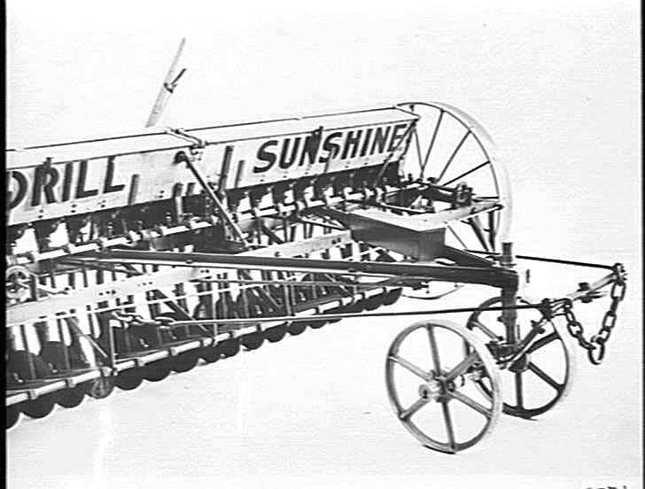 Horse-drawn 'Sun' disc grain & fertilizer drill fitted with concave steel wheels and cast steel dual-wheel fore carriage. Raising and lowering is by hand levers. Discs are 13 inch diameter and spring loaded for penetration. Note the tool box on the main frame at the front.
