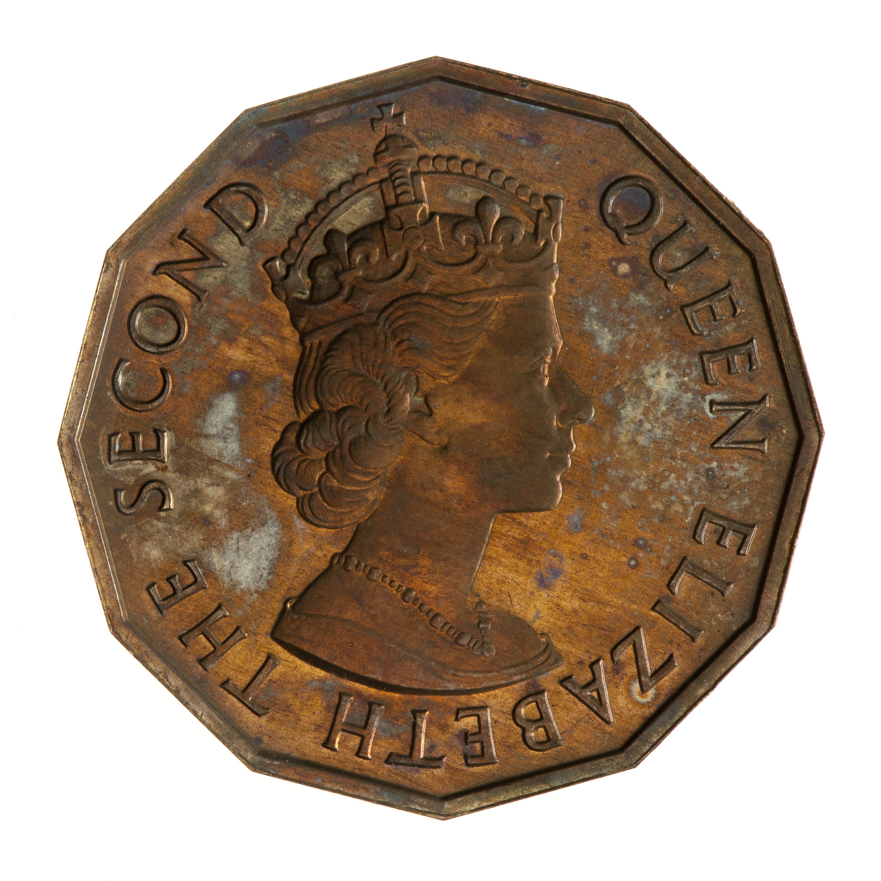 Crowned bust of the queen facing right; around, QUEEN ELIZABETH THE SECOND; artist's initials, CT, incuse on bust truncation