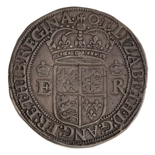 At centre within a partial beaded circle, Royal shield of arms crowned between E and R, both letters crowned; around, 0 ELIZABETH D:G: ANG: FR: ET . HIB: REGINA
