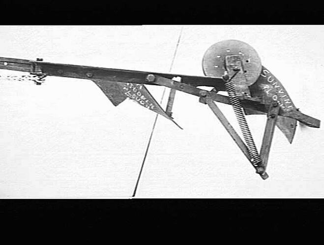 A horse-drawn 'Sunvine' single-furrow mouldboard plough, in its maximum depth-ploughing position.