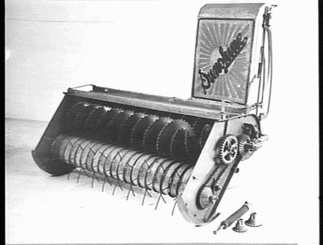 A No.3 pickup front (for attachment to a header) is used for gathering windrow left by a mower or rake, for harvesting of grasses, such as clover, ryegrass, etc. In the foreground are sprockets for changing the speed of the pick-up reel. Also shown is a