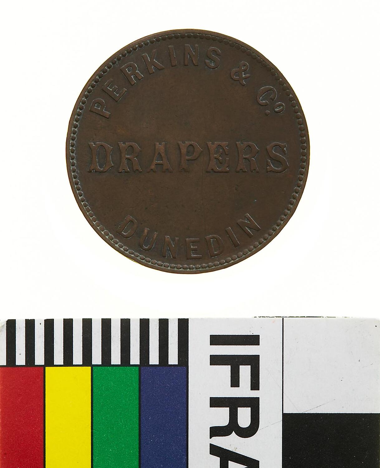 Obverse: PERKINS & Co DRAPERS DUNEDIN Reverse; DUNEDIN NEW ZEALAND