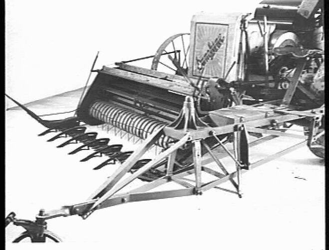 A No.4 pickup front, attached to a ground-drive header, fitted with cutter-bar attachment used for harvesting peas and other similar crops. The crop is cut by the cutter-bar, then lifted by the rotating fingers and fed into the elevator for threshing.