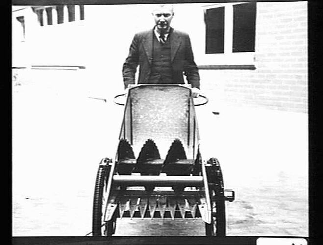 Mr Shea is shown here with a harvesting machine designed by Mr Headlie Taylor. 'Ergot' is a growth on rye grass and was processed and used as a preservative for meat, etc. during World War II. Ergot was previously imported from Japan. The machine w