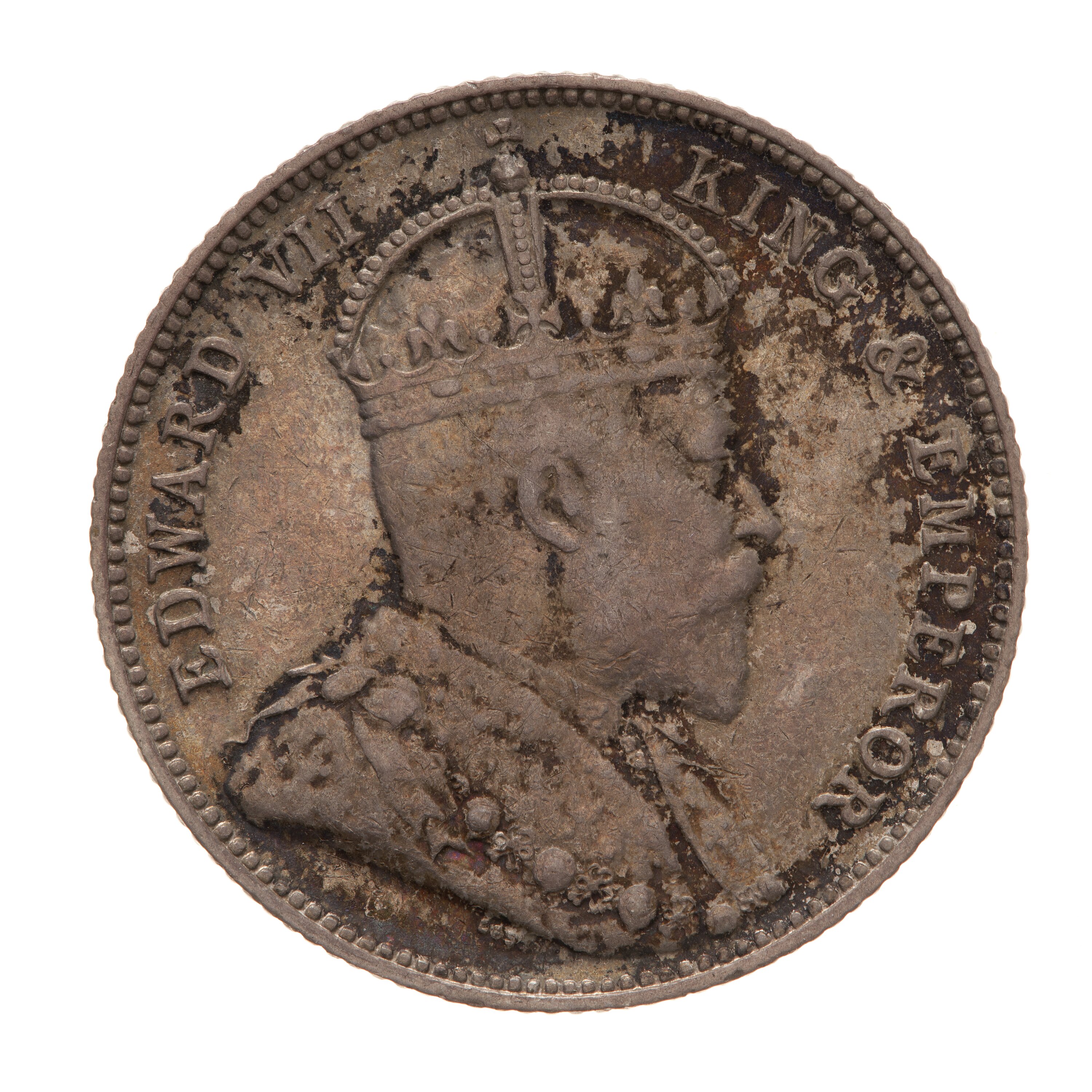 Crowned and draped bust of the King facing right, the King is wearing the Imperial Crown and the ermine Robe of State, the Collar of the Most Honourable Order of the Bath; around, EDWARD VII KING & EMPEROR; below the bust truncation, the artist's initials, DES