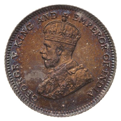 Crowned and draped bust of the King facing left, the King is wearing the Imperial Crown and the ermine Robe of State, the Collar of the Most Noble Order of the Garter, and the Badge of the Most Honourable Order of the Bath; around, GEORGE V KING AND EMPEROR OF INDIA; on bust truncation, the artist's initials, BM