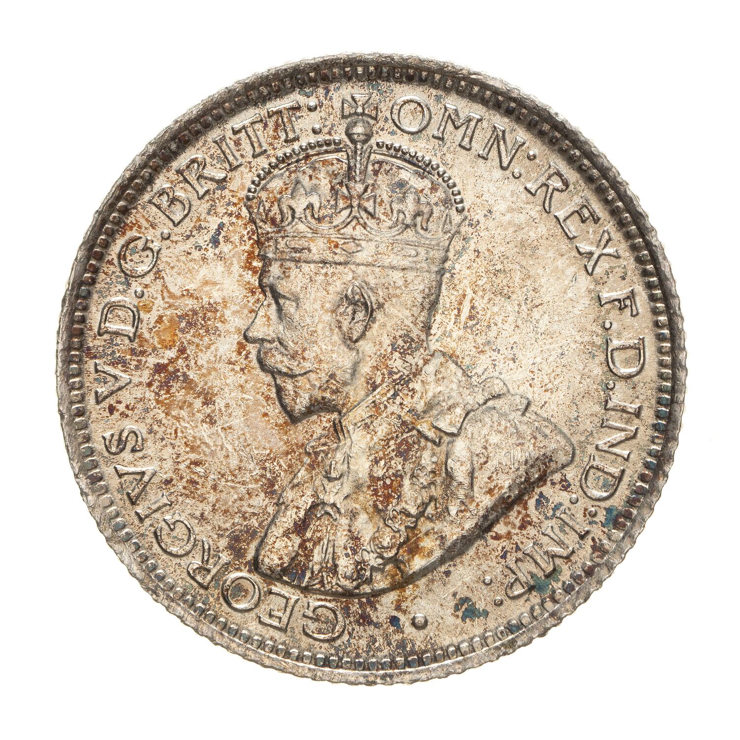 Crowned and draped bust of the King facing left, the King is wearing the Imperial Crown and the ermine Robe of State, the Collar of the Most Noble Order of the Garter, and the Badge of the Most Honourable Order of the Bath; around, GEORGIVS V D.G. BRITT: OMN: REX F.D. IND: IMP:; artist's initials BM on bust truncation
