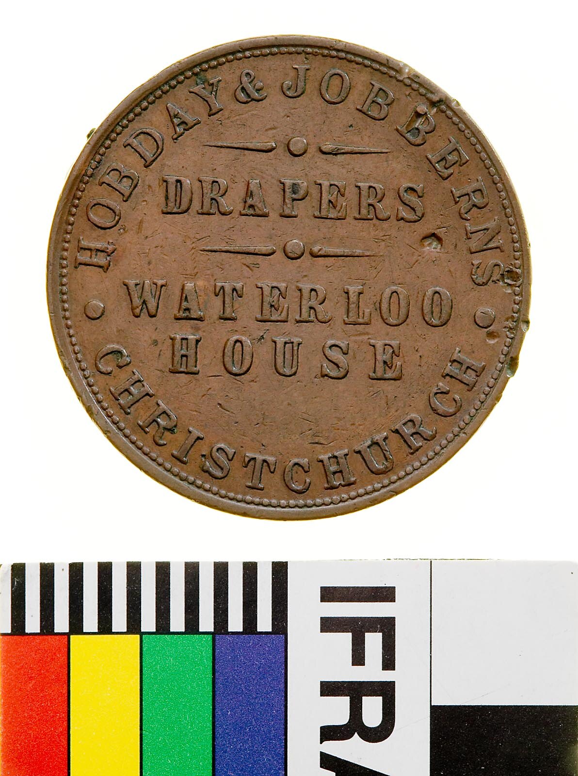 A round copper token (34 mm diameter). The piece features the name, address and business of the issuer: Hobday & Jobberns, Waterloo House, Christchurch, Drapers. The reverse features a shield set above a ribbon with the motto ADVANCE CANTERBURY. The top third of the shield depicts a railway line emerging from a tunnel. Below are argicultural symbols - a wheat sheaf, horse head, cow head and plough.