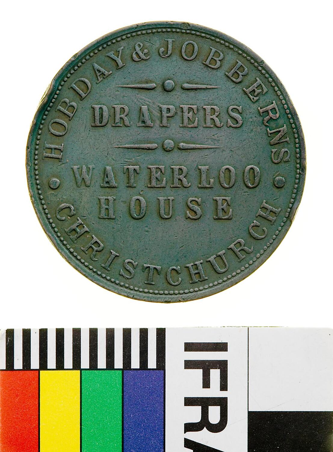 A round copper token (34 mm diameter). The piece features the name, address and business of the issuer: Hobday & Jobberns, Waterloo House, Christchurch, Drapers. The reverse features a shield set above a ribbon with the motto ADVANCE CANTERBURY. The top third of the shield depicts a railway line emerging from a tunnel. Below are argicultural symbols - a wheat sheaf, horse head, cow head and plough.