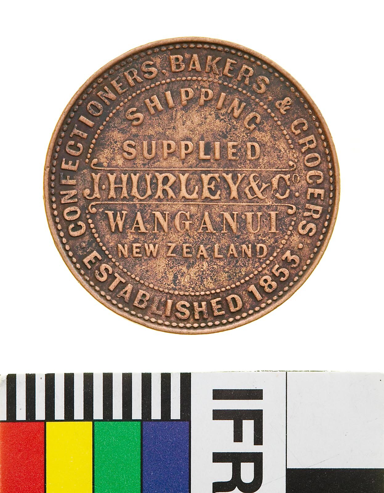 Obverse: J. HURLEY & Co. CONFECTIONERS BAKERS & GROCERS ESTABLISHED 1853 SHIPPING SUPPLIED WANGANUI NEW ZEALAND Reverse: TODMAN LONDON