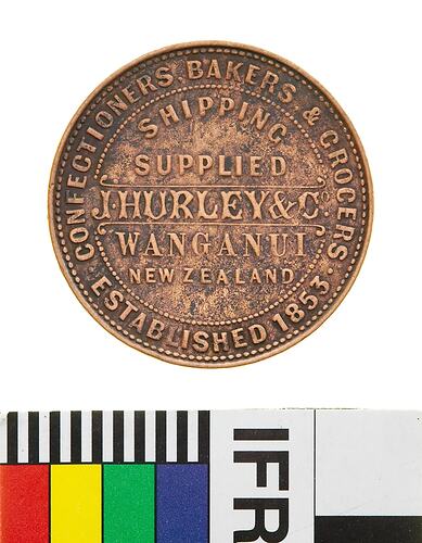 A round bronze token (31 mm diameter). The piece features the name, address and business of the issuer: J. Hurley & Co. confectioner, baker and grocer in Wanganui. The reverse features a seated female figure holding an anchor in her left hand and extending her right above bales, a bee-hive set on a stand through which an inverted cornucopiae spills fruit on the ground. To the right is a cliff with wheat sheaves at its base and on the left near the horizon of the sea, a three-masted sailing ship. Cleaned and half re-toned dark green