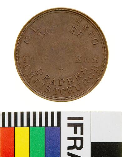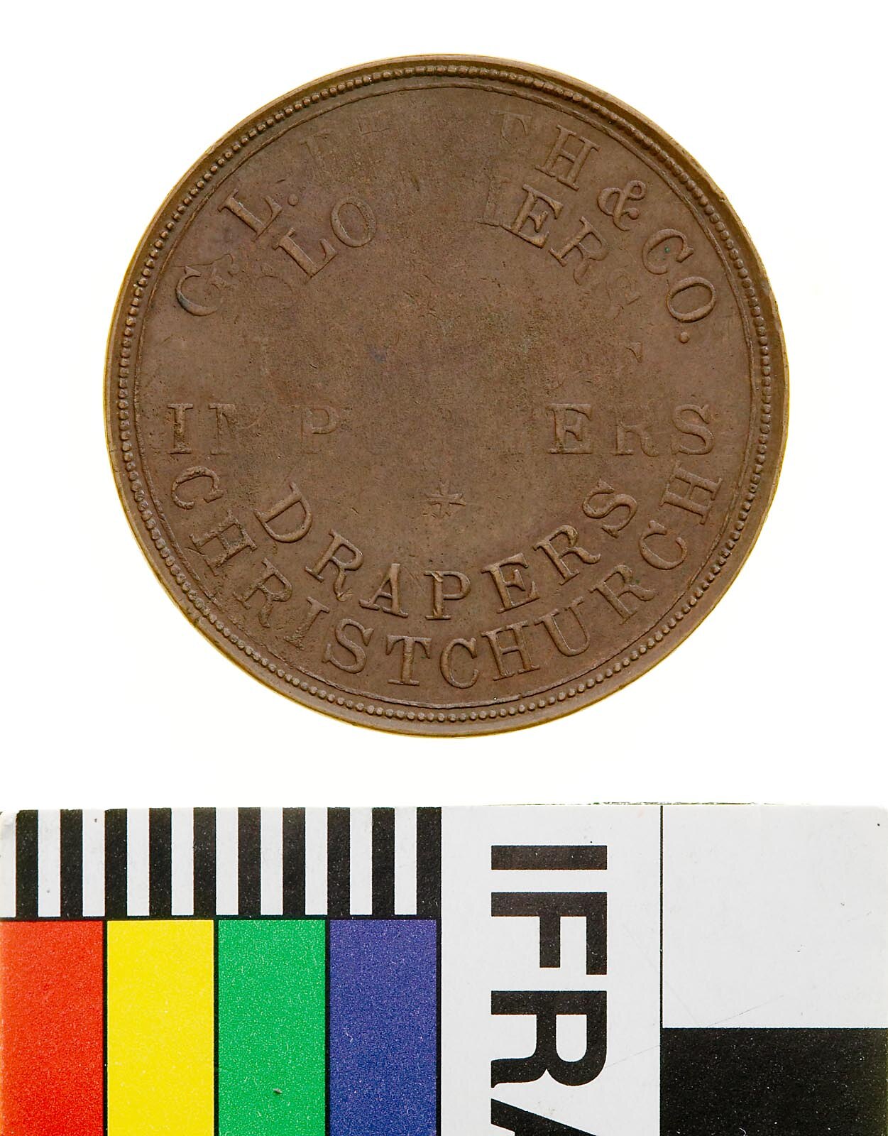 A round copper token (31 mm diameter). The piece features the name, address and business of the issuer: G.L Beath & Co., Argile House, Cashel Street, Christchurch, importers, clothiers and drapers. The reverse features a coat of arms with lion supporters. This token was very weakly struck.