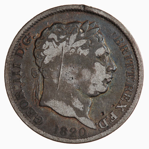 Laureate head of the King facing right; around, GEOR III D G BRITT REX F D ; below, 1820