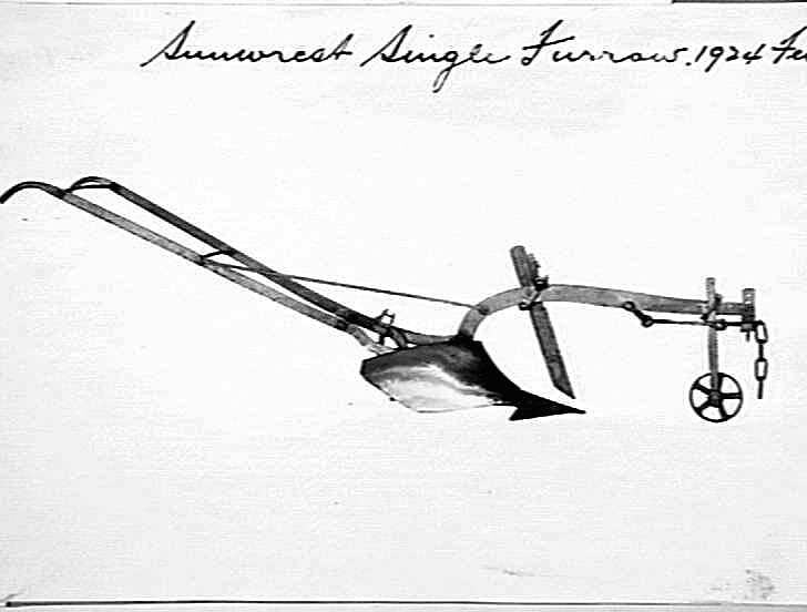 A horse-drawn 'Sunwrest' single-furrow plough with blade coulter.