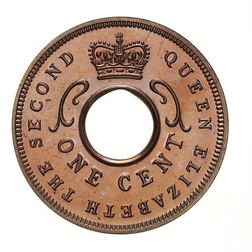 A central hole with curved floral design to left and right; above hole, crown; below hole in one line, ONE CENT; around, QUEEN ELIZABETH THE SECOND