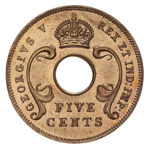 A central hole with curved floral design to left and right; above hole, crown; below hole in two lines, FIVE / CENTS; around, GEORGIVS V REX ET IMP: IND: