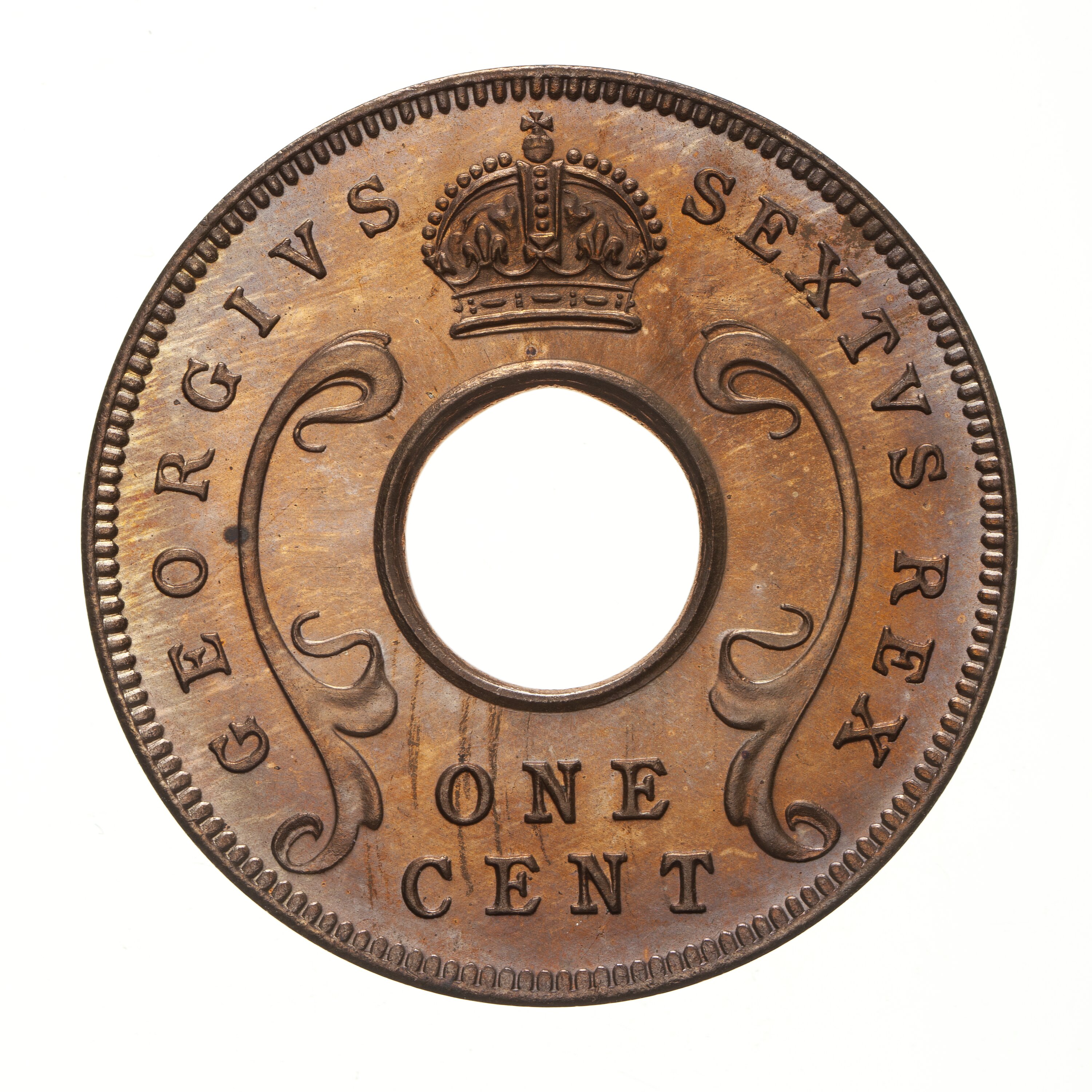 A central hole with curved floral design to left and right; above hole, crown; below hole in two lines, ONE / CENT; around, GEORGIVS SEXTVS REX