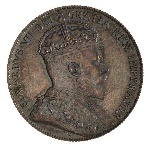 Crowned and draped bust of the King facing right; around, EDWARDVS VII DEI GRATIA REX IMPERATOR; the artist's initials, DES, in field below bust